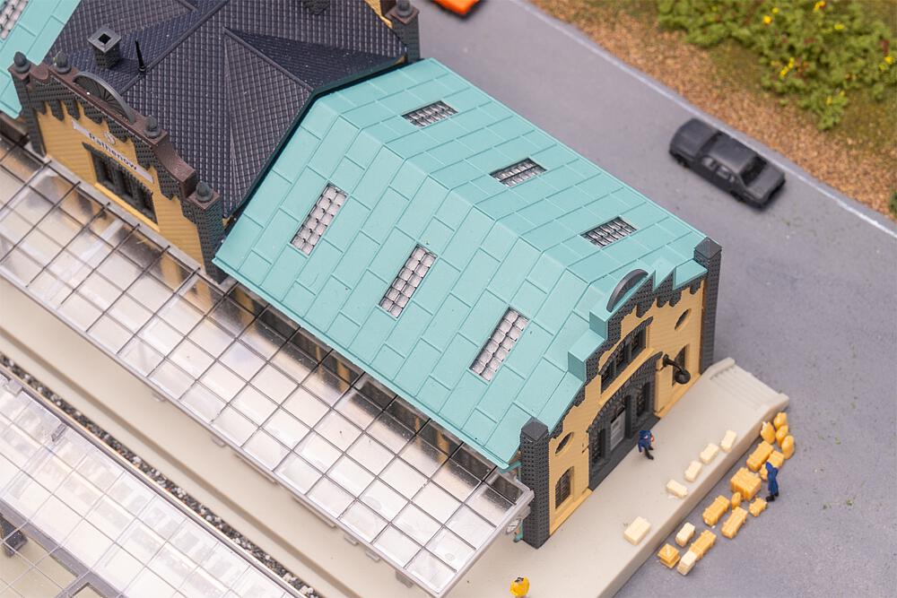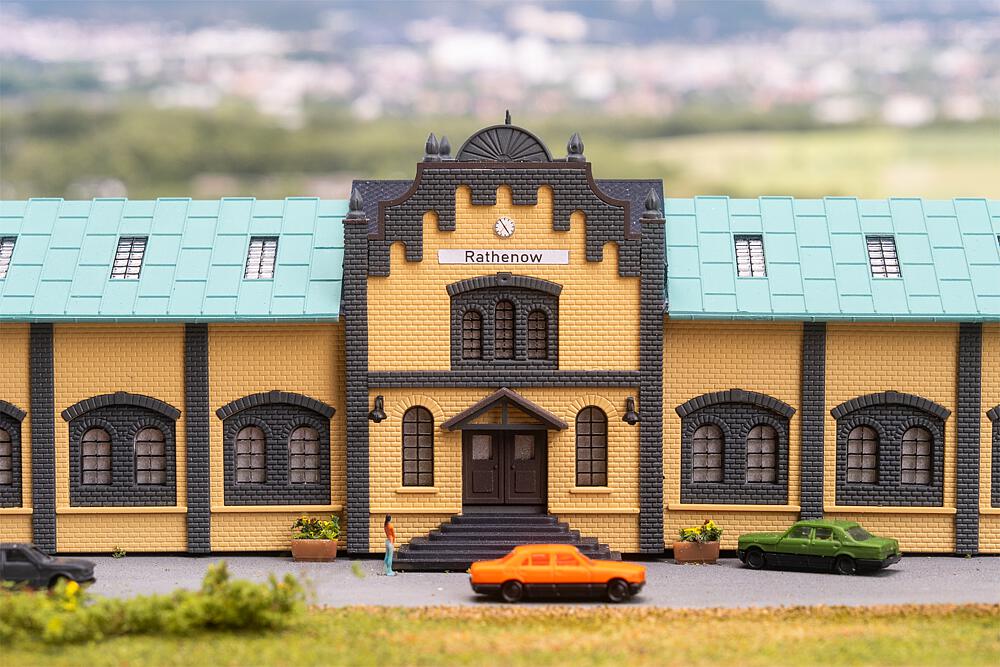 Dieses Modell fängt den Charme der Jahrhundertwende ein: hell-türkises Dach, helle gelbe Steinfassade und eine verglaste Bahnsteigüberdachung auf der Bahnseite verleihen dem Bahnhof Charakter. Die klare Klinkerbauweise und liebevolle Details machen ihn zu einem stimmungsvollen Mittelpunkt jeder Anlage. Das Modell ist architektonisch eigenständig und hat keinen Bezug zum Originalbahnhof in Rathenow (Brandenburg).