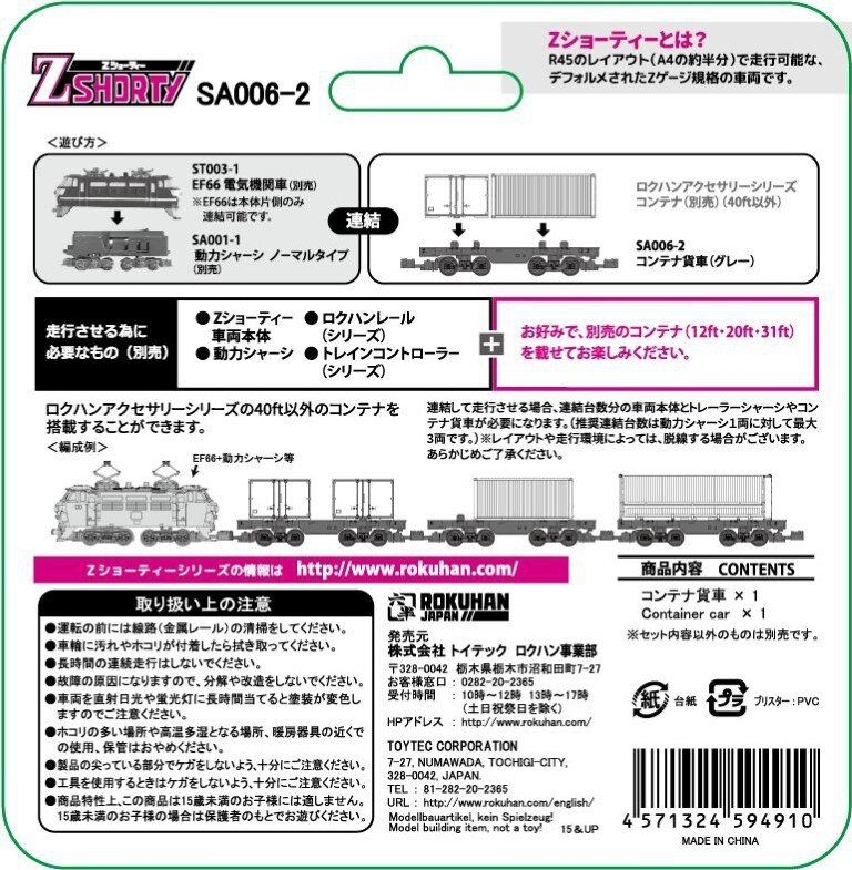 Possible to load Rokuhan Container series. Suit 12ft container series (A103 & A104 type) x 2 or 20ft container series (A105, A106, A107 & A108 type) x 1 + 31ft container series (A102 type) x 1
