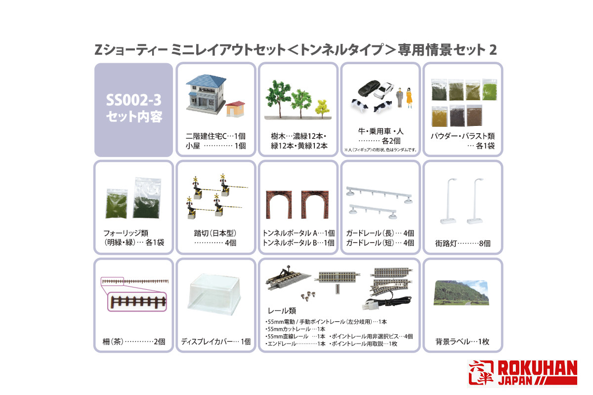1 x zweistöckiges Haus C, 1 x Schuppen, 12 x dunkelgrüne Bäume, 12 x grüne Bäume, 12 x gelbgrüne Bäume, 2 x Kühe, 2 x Autos, 2 x Puppen, 5 Arten von Pulver, 2 Arten von Schotter, 1 Beutel mit hellgrünem Laub, 1 Beutel mit grünem Laub, 4 x Bahnübergänge im japanischen Stil, 1 x Tunnelportal A, 1 x Tunnelportal B, 4 x