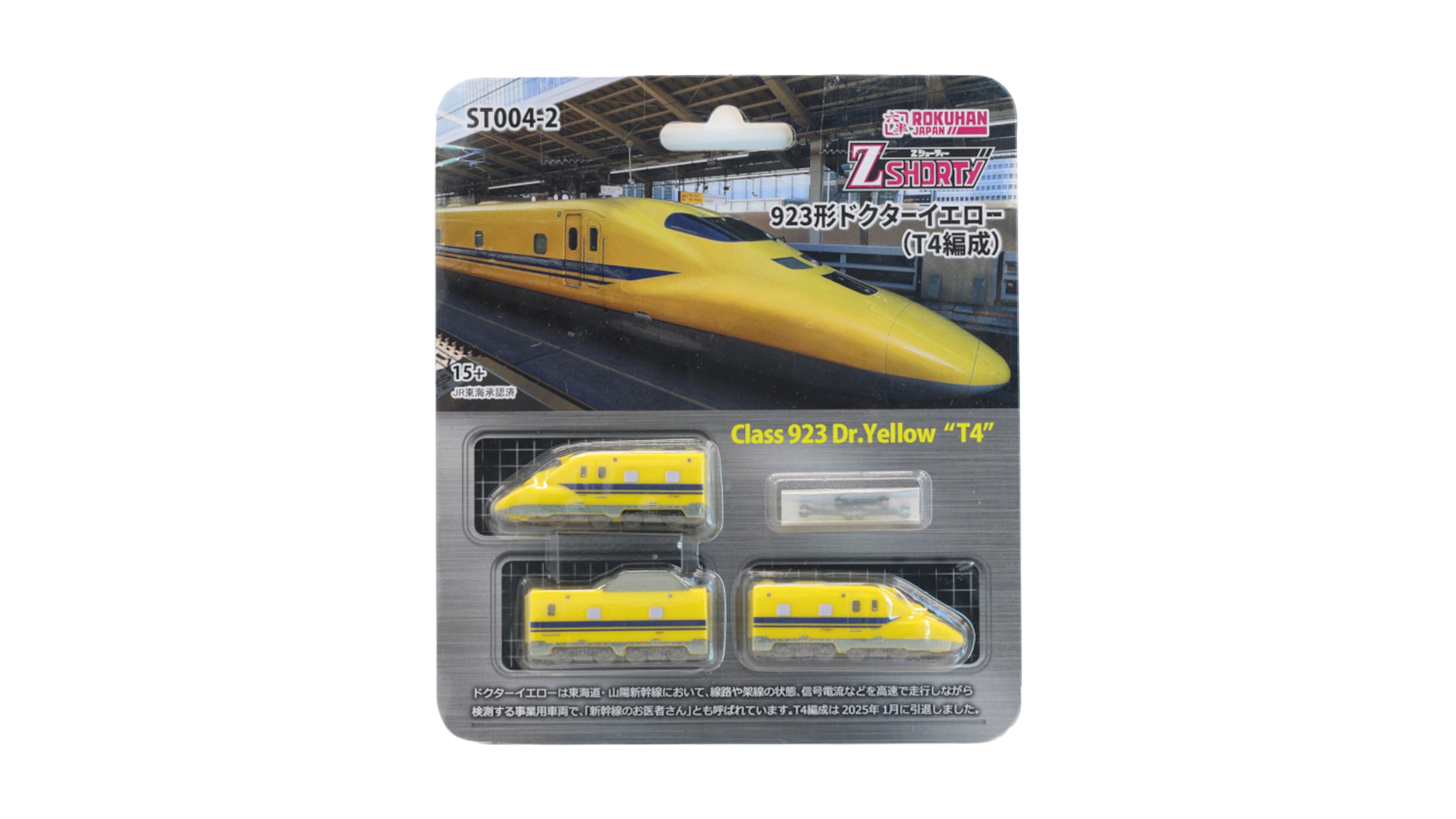Die Serie 923 „Dr. Yellow“ ist nun als Z-Shorty von ROKUHAN erhältlich. Der Shinkansen überwachte bei Hochgeschwindigkeit den Zustand von Gleisen, Oberleitungen und Signalanlagen auf der Tokaido- und Sanyo-Strecke und ist daher als „Shinkansen Doctor“ bekannt. Nach seiner Abschiedsfahrt wurde der von JR Central eingesetzte T4_Zug im Januar 2025 aus dem Dienst genommen. Das Z_Shorty_Modell verkürzt den Zug auf etwa halbe Wagenlänge, behält aber die typische, gelbe Lackierung und die charakteristische Form bei und lässt sich mit separat erhältlichem Motor_und Trailer_Chassis wie ein normaler Spur_Z_Zug betreiben.