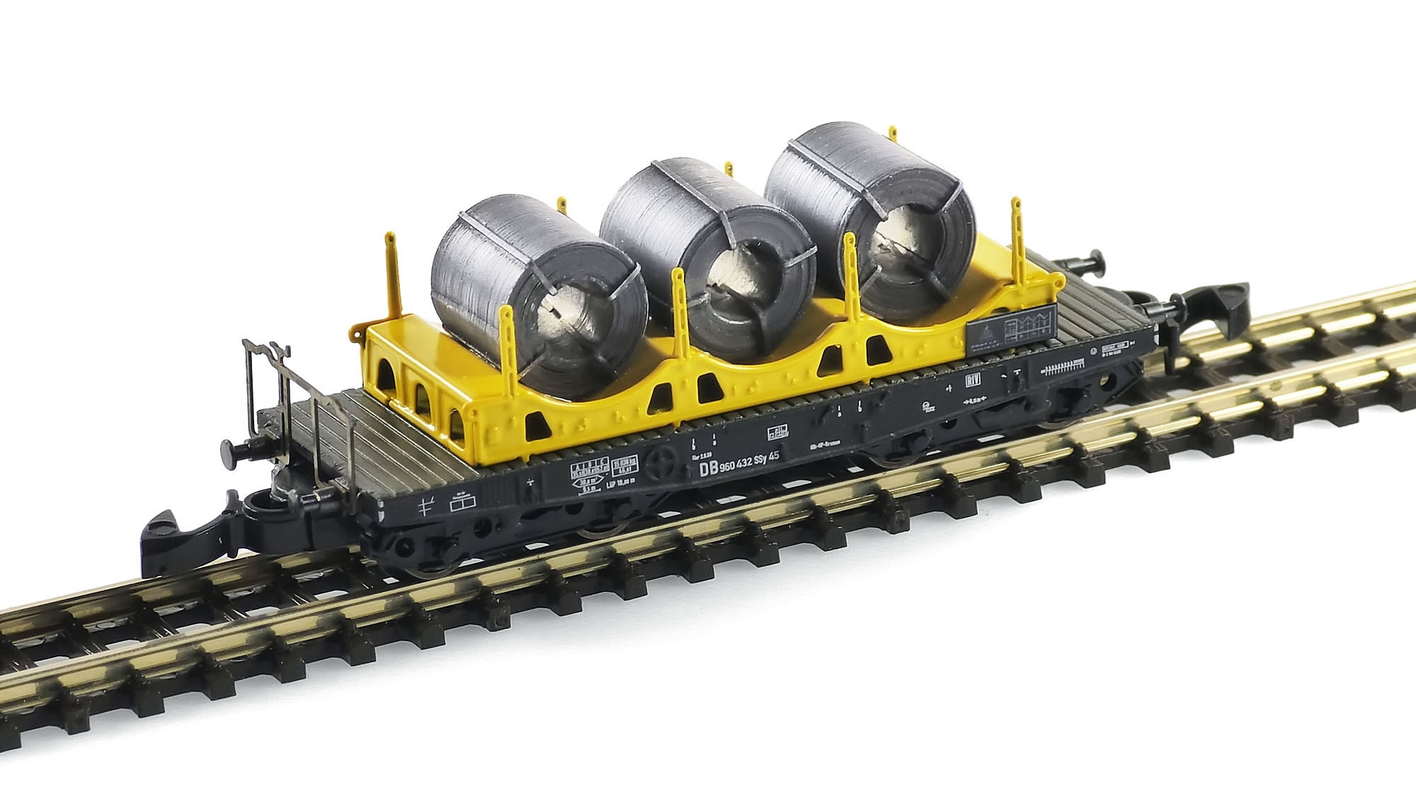 High quality realistic load inserts for heavy duty flatcars are made entirely of metal. The base framework is made of 0.3 mm nickel silver with many intricate half-etched details, assembled using PCB hot air soldering technology and airbrushed with lacquer paint. Coils are made of real 0.1 mm thick stainless steel wounded into reels and fixed with thin nickel silver ties; they are also airbrushed with iron dye and underwent special treatment to receive natural brushed texture