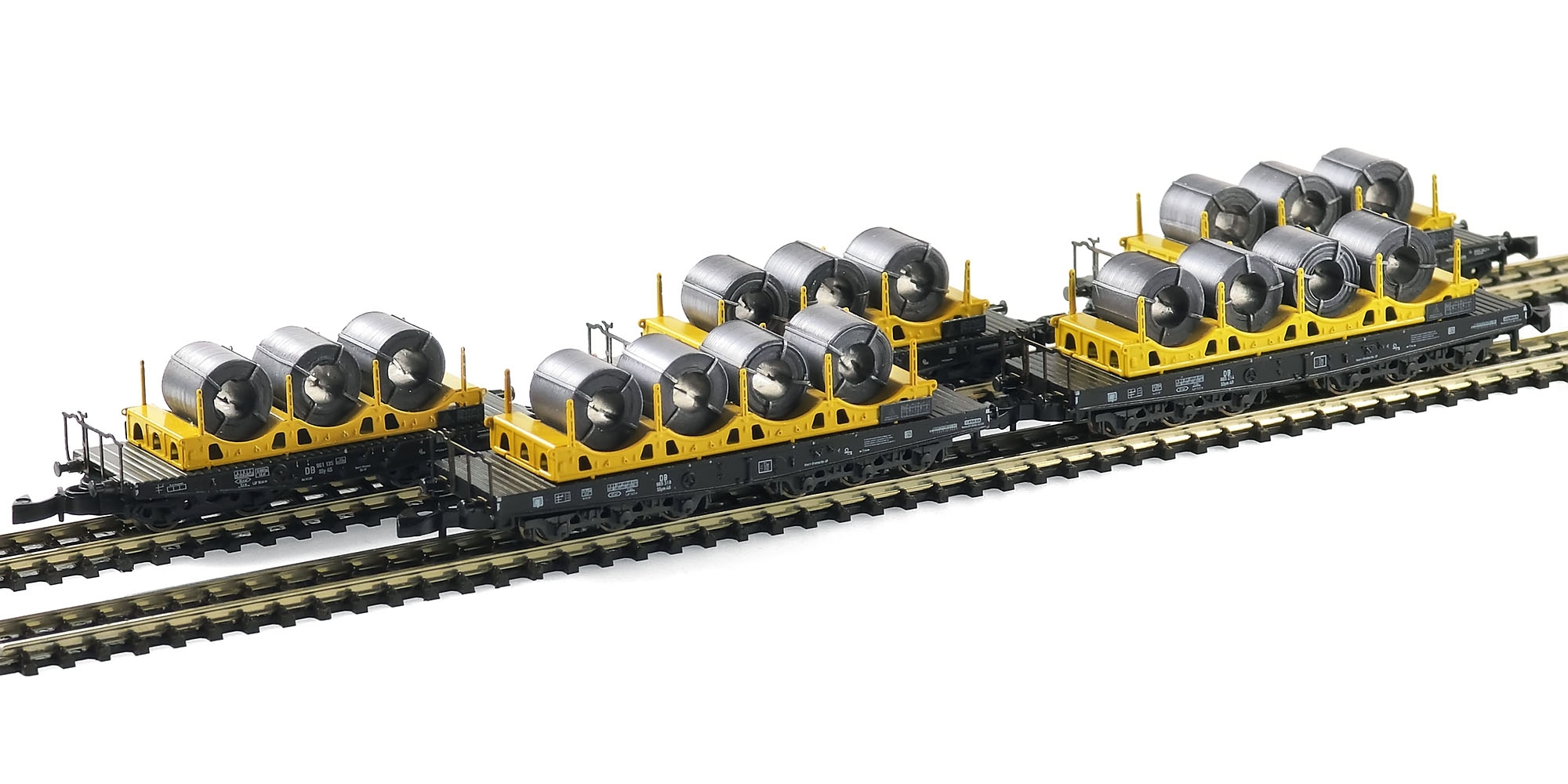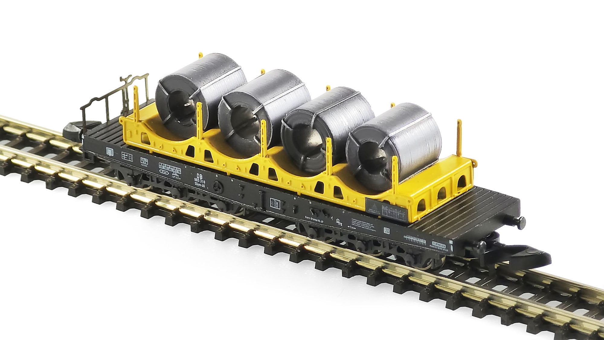 High quality realistic load inserts for heavy duty flatcars are made entirely of metal. The base framework is made of 0.3 mm nickel silver with many intricate half-etched details, assembled using PCB hot air soldering technology and airbrushed with lacquer paint. Coils are made of real 0.1 mm thick stainless steel wounded into reels and fixed with thin nickel silver ties; they are also airbrushed with iron dye and underwent special treatment to receive natural brushed texture.