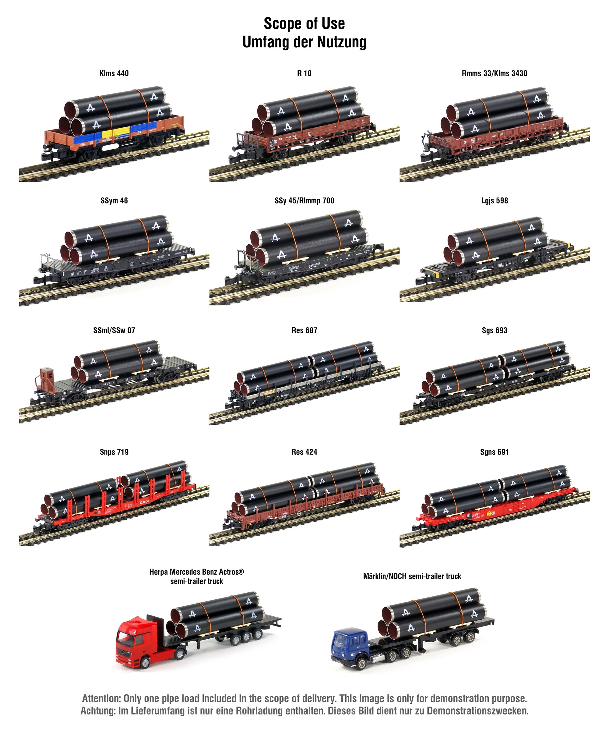 Type R 10 stake car: Märklin 8144, 8217, 8658, 8664, 80002, 80421, 80727, 80816, 81302, 81423, 81433, 82100, 82101, 82102, 82103, 82515, 82518, 82572, 86000, 86580