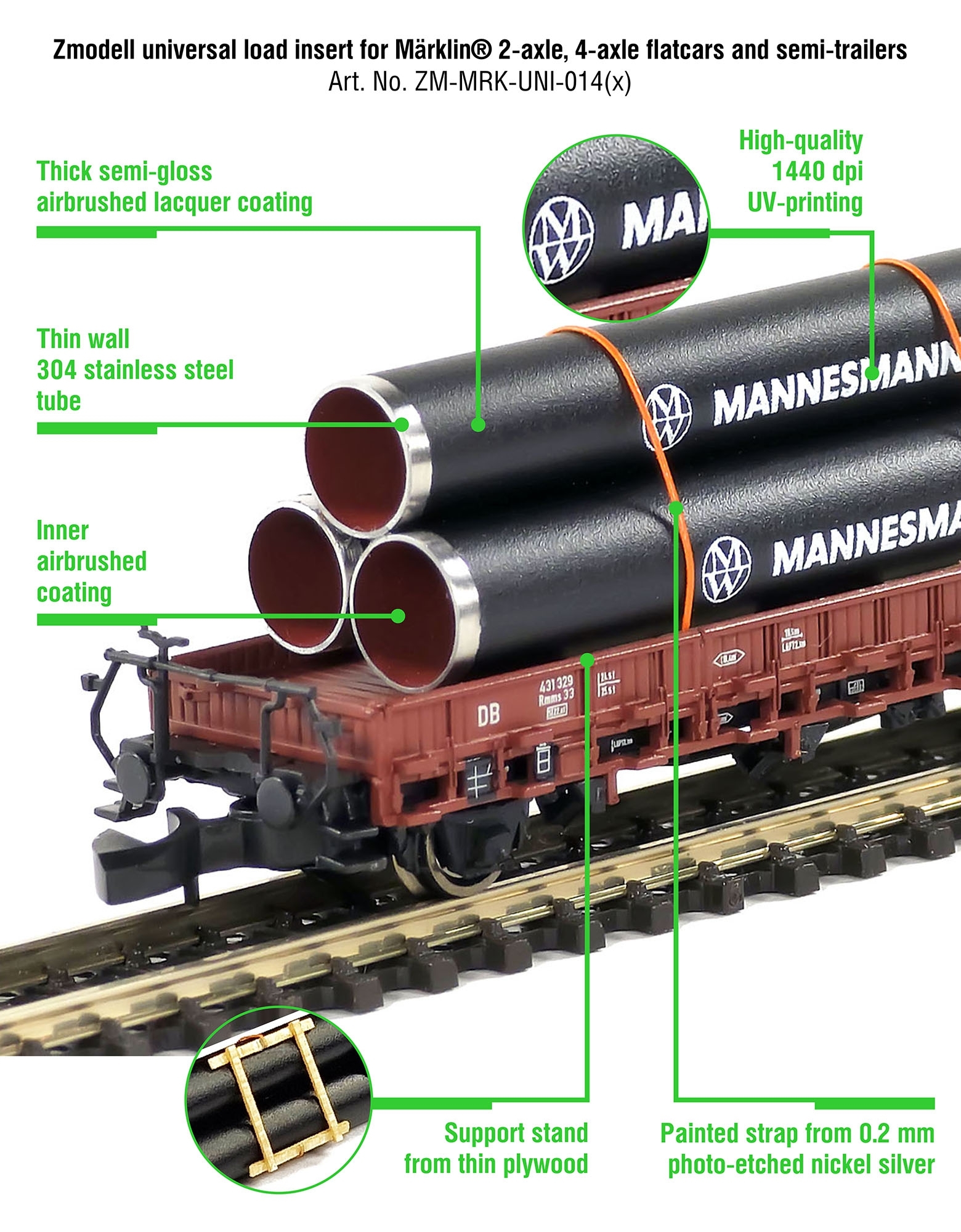 Material: 304 stainless steel tubes polished and airbrushed inside and outside, painted photo-etched nickel silver straps, veneer racks