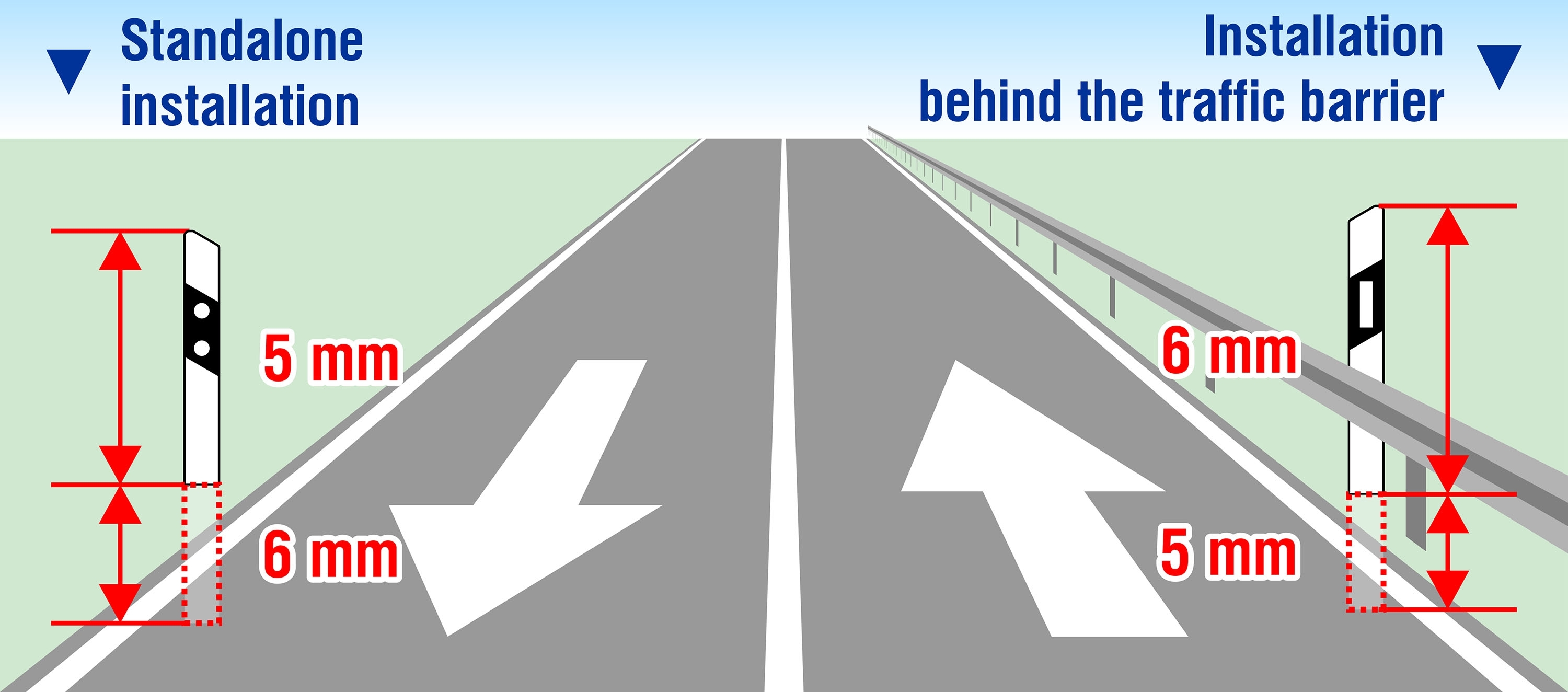 Information: The height of the delineator post must be 5 mm when installed standalone and 6 mm when installed behind the traffic barrier (Art. No. Zmodell ZM-MS-031).